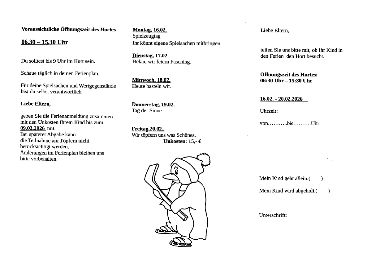 wir möchten Sie darüber informieren, dass sich unsere Hausaufgabenzeit ab Januar 2026 auf 14:00 bis 15:00 verlegt. Diese Anpassung ermöglicht es uns, im Anschluss täglich abwechslungsreiche und fördernde Beschäftigungsangebote für die Kinder durchzuführen.