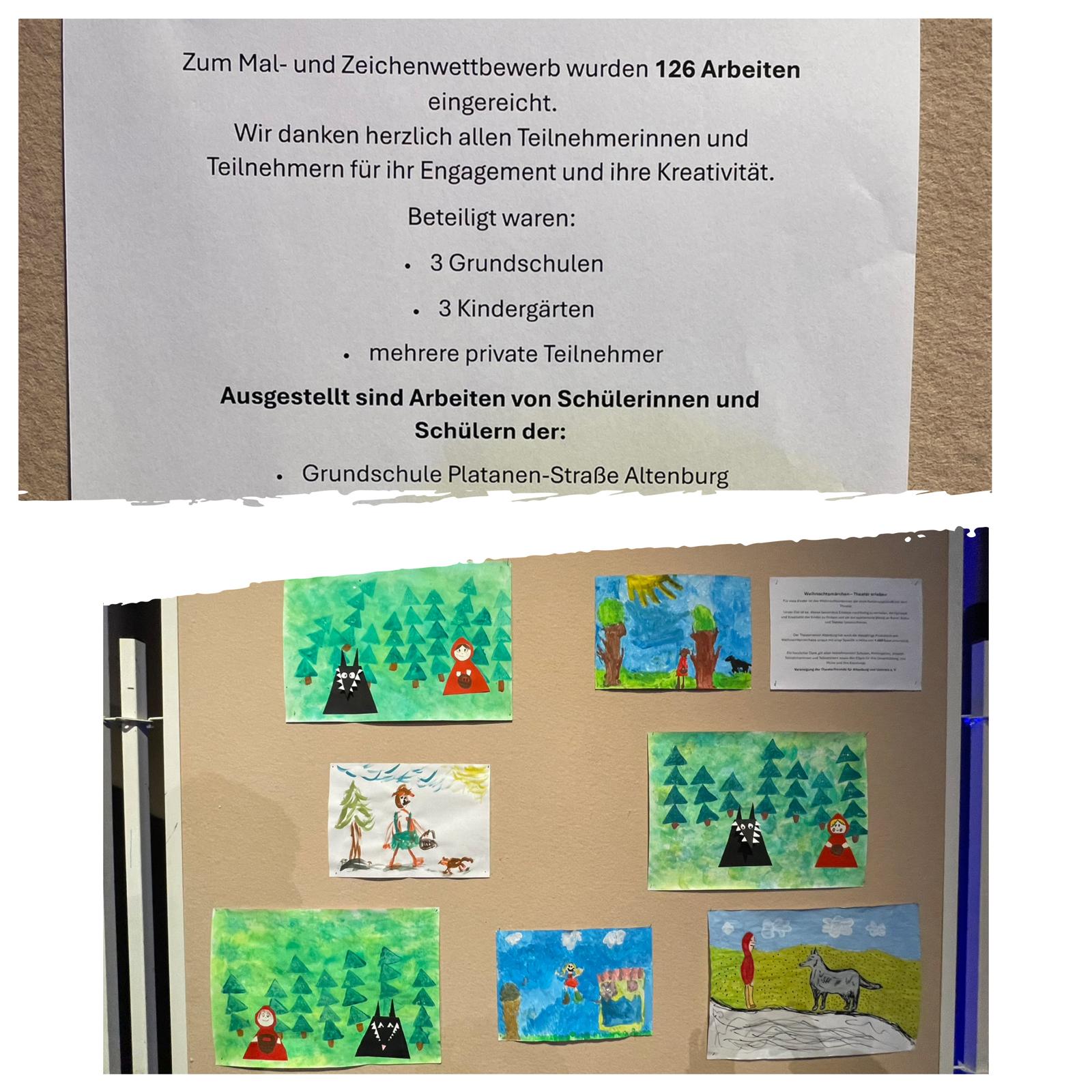 Auch in diesem Jahr nahmen Kinder unserer Schule am Mal- und Zeichenwettbewerb des Theatervereins zum Weihnachtsmärchen teil. Nachdem die ganze Schule im letzten Jahr beim Weihnachtsmärchen "Rotkäppchen und der Wolf" gewesen war, nahm unsere wunderbare Zeichenlehrerin Frau Schmidt das Thema im Zeichenunterricht auf. Die Bilder wurden eingesendet und sind im Theaterzelt zu bestaunen.